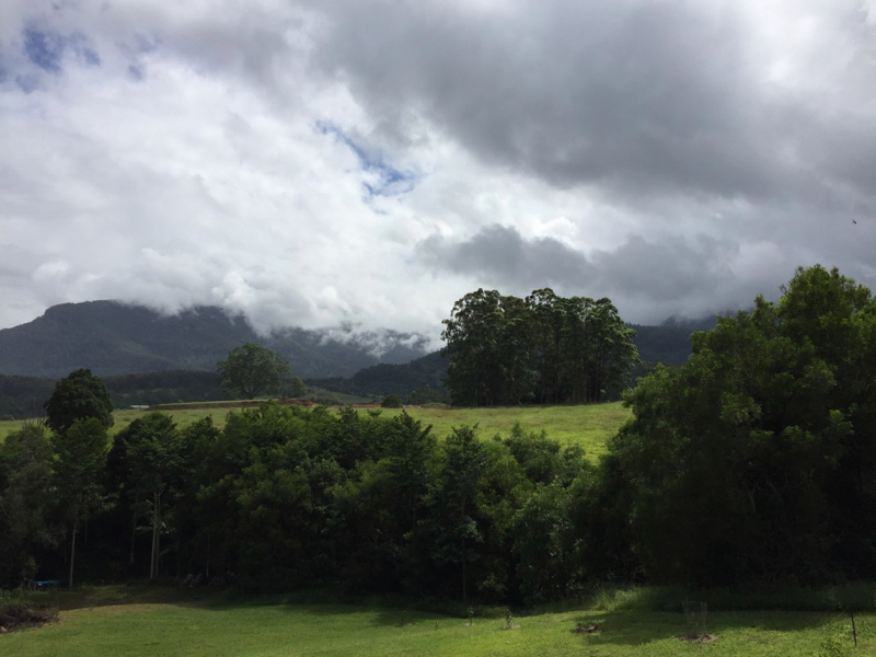 In front of me, all I can see is green. Green grass, green trees, green hills and green mountains. I can hear the creek that runs at the back of the property and the birds singing. The fresh smell of wet soil and bush is invigorating.